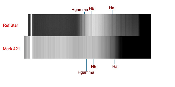 Ora, le righe dello spettro di Mark 421 risultano leggermente allargate per effetto dello spettro della galassia compagna, tuttavia la Hb risulta sicuramente , anche se in modo lieve , anche nello spettro del blazar in assorbimento. Mettendo a registro i due spettri,la differenza di spostamento verso il rosso delle righe di quest'ultimo rispetto alla stella di controllo risulta di 6 pixel, corrispondenti, alla risoluzione di 23,7 A/Pixel, a 142 Angstrom, il che vuol dire che la riga Hb si troverebbe a 5003 A anzichè a 4861.Il redshift del Blazar sarebbe quindi 142/4861 = 0,0292, con un errore di 0,0008 rispetto al valore reale di 0,03 che può ritenersi accettabile in rapporto alla strumentazione usata , al livello di risoluzione, ed al basso redshift dell'oggetto.La ridotta velocità dell'oggetto (ca 8760 Km/sec) ed il basso livello di risoluzione dello spettroscopio usato rendono pressocchè inutile l'applicazione della formula relativistica, che fornisce comunque valori simili.