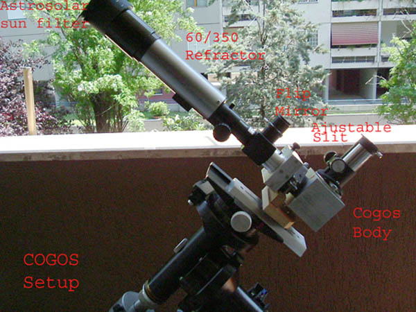COGOS col rifrattore 60/350.Tra i due è stato inserito un flip mirror per poter puntare la zona del disco solare della quale si intende osservare lo spettro.Notare che per tale funzione al rifrattore è stato applicato un filtro in Astrosolar, che sarà tolto per la ripresa dello spettro.Assicurarsi, prima di porre l'occhio all'oculare del flip mirror, di aver messo il filtro. COGOS with the 60/350 chinese refractor. A flip mirror was inserted among the two elements in order to permit the visualization of the zone of solar disk to be observed.Note that, for such function, to the refractor was applied an Astrosolar filter ,to be taken off for the spectrum observation.Be sure, before applying your eye to the eyepiece, that the filter is in place.