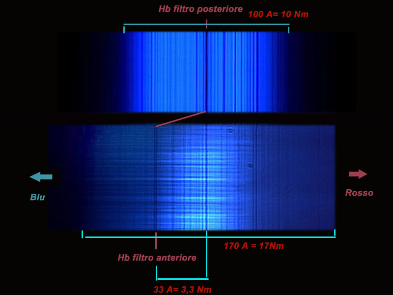 Un ulteriore interessante esperimento è stato effettuato ponendo il filtro in questione anteriormente alla maschera col foro di entrata posta davanti alla lastra correttrice del telescopio e paragonando lo spettro ottenuto con tale sistema a quello precedente ,col filtro in posizione canonica dietro il fascio ottico collimato.La ricezione di un fascio ottico non collimato e la luce diffusa ha prodotto, oltre che un notevole allargamento della banda passante e immagini fantasma, anche uno spostamento verso il blu della riga Hb di circa 3,3 nm, assumendo che il centro di banda corrispondesse al centro della zona di massima intensità luminosa. A further interesting experiment was done putting the filter before the hole of the mask on the corrector lens of the telescope and comparing the spectrum obtained with the previous one, with the filter on the path of a collimated beam.The incoming not collimated light beam a the diffuse light caused a widening of bandwidth and ghost images, and a shift of about 3,3 nm of the Hb line toward the blue.