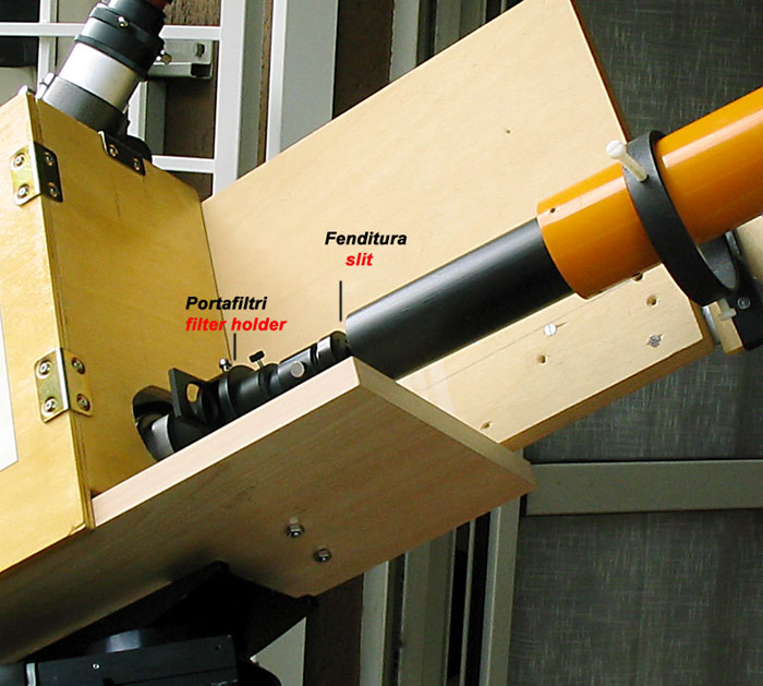 Alcune lievi modifiche sono state recentemente effettuate allo strumento, per migliorare il suo funzionamento come spettroelioscopio: una di queste è stata l'abolizione della lente di barlow posta al fuoco del telescopio (il rifrattore 60/415) e che aveva originariamente la finalità di aumentare la focale ed il potere risolutivo dell'immagine solare proiettata sulla fenditura.Ciò per due motivi: il primo che l'aggiuntivo ottico portava il fuoco del telescopio in un punto troppo interno al collimatore, causando problemi nella messa a fuoco generale del sistema, il secondo che purtroppo il calore eccessivo sulla lente, posta in prossimità del fuoco, causava una probabile alterazione della sua figura ottica degradando l'immagine.L'altra modifica ha riguardato l'inserimento di una slitta portafiltri immediatamente dopo la fenditura, con un duplice effetto; di permettere l'inserimento di filtri (polarizzatori per la eventuale misura dell'effetto Zeeman, od altri) e di ottenere una migliore areazione del tubo con la fenditura smaltendo una parte del calore che si accumula inevitabilmente su di essa (Fig 1).A proposito di filtri, risulta a mio avviso utile, per aumentare il contrasto, l'inserimento,nell'adattatore 31.8 della camera ed in luogo di una fenditura in uscita, di un filtro a banda stretta centrato sulla riga in esame o sulle sue vicinanze.