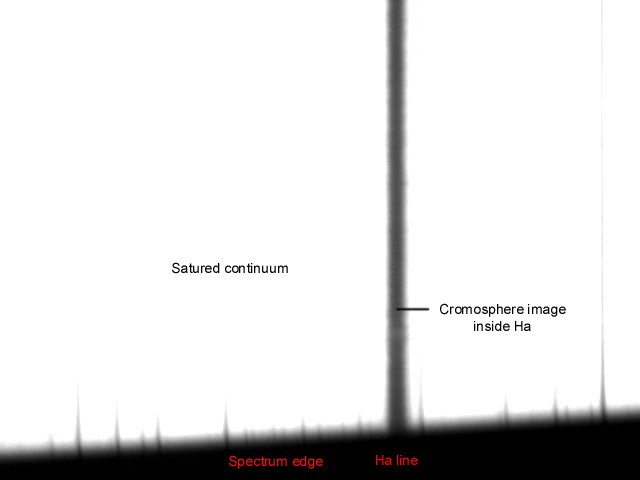 Once done the preliminary focus operations above described, the focus must be refined on the details inside the line (the details of cromosphere visible inside the Ha line in Fig.3 and 4).It will be necessary, at last, to regulate the slit opening to obtain a clear but not saturated line, in a contour of a saturated continuum.If one shut excessively the slit jaws, the spectral image will be better , as shown in Fig 5, but the quality of solar scan will be degraded by the the transverse lines due to imperfections or dust on the slit.