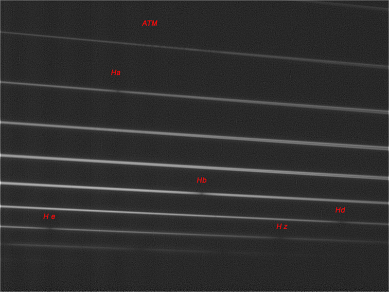 L'immagine che segue è quella dello spettro bidimensionale della stella Vega (Alfa Lyrae) ripreso con Star Shel al fuoco di un Celestron 8, integrazione di 2 secs per frame su una media di 30 frames con una camera DMK 41 AS.Si notano, nello spettro dall'IR all'UV,praticamente quasi tutte le righe della serie di Balmer dell'Idrogeno